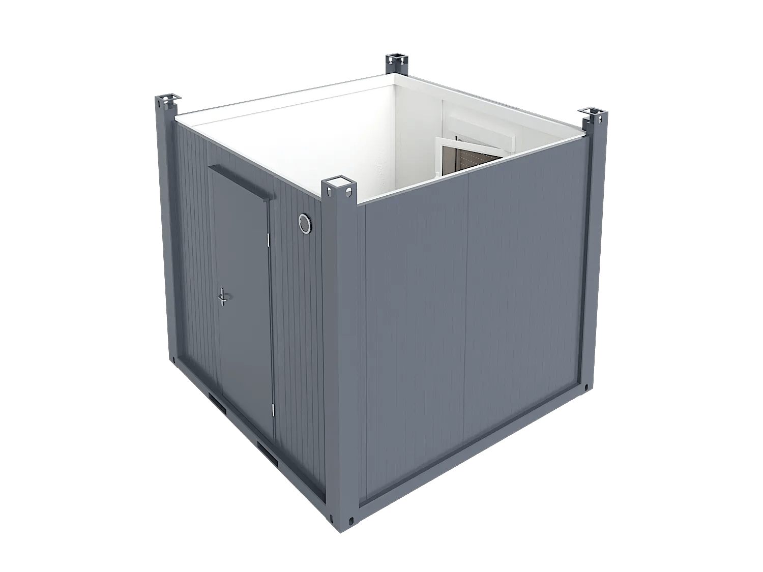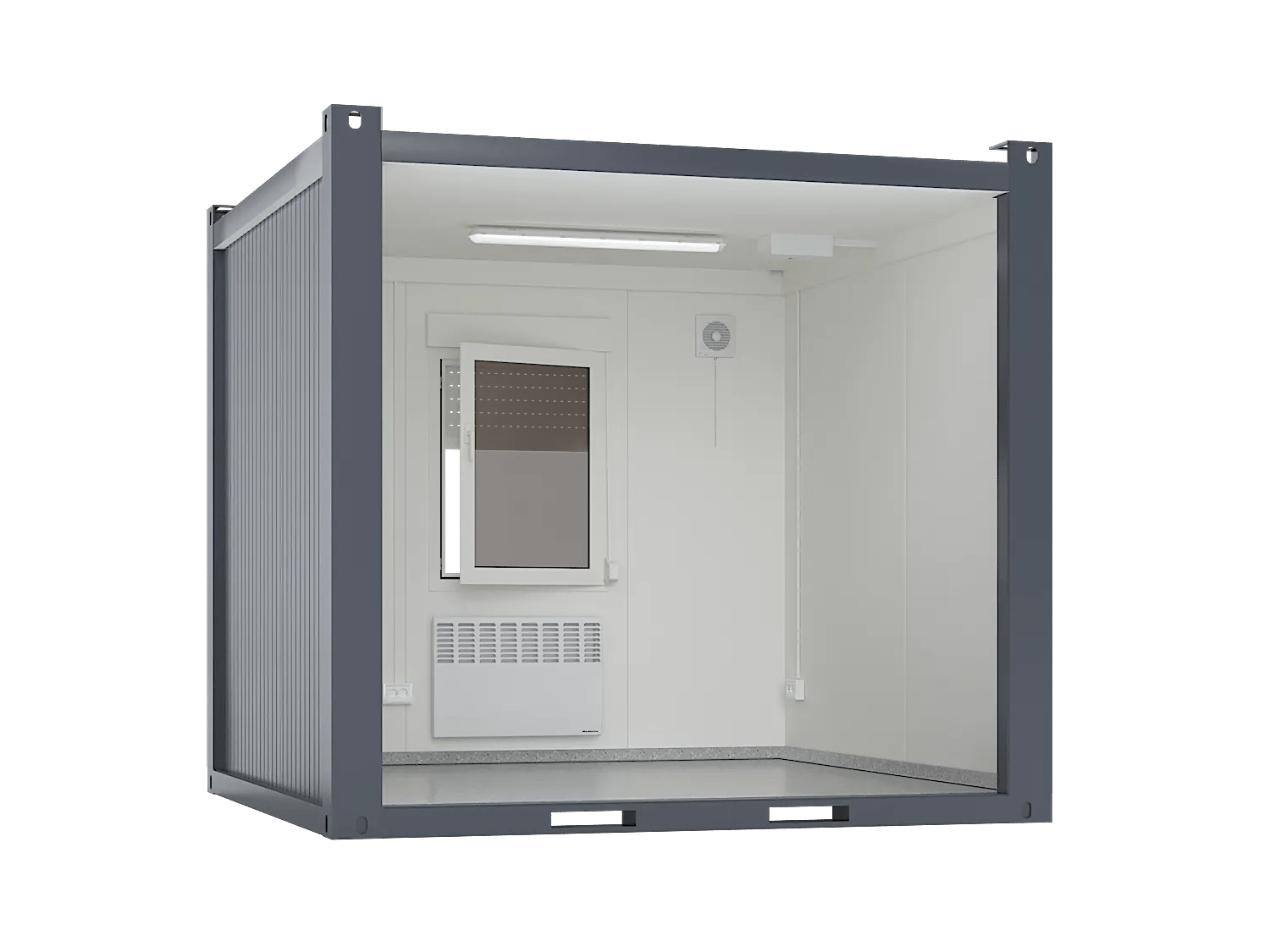 The 10′ Office Container can be equipped with several accessories and the desired layout. Popular accessories include air source heat pumps, computer sockets, heat recovery ventilation machines, and additional windows. The window of the container has standard aluminum roller shutters, meaning that you can safely close up for the night, for example. Handling with crane from the corner pieces or forklift pockets.