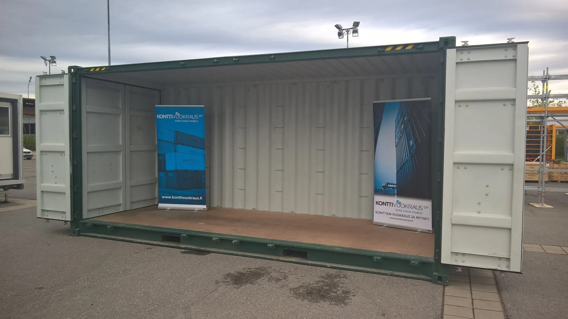 A very practical container when you need a space solution that can be implemented quickly, for example for a trade fair, as a pop-up store, a performance stage or a promotional space. The container’s double doors and the opening side can be locked with padlocks, so you can leave all your belongings in the container after the event and continue the next day without any extra moving of the goods. The model is also very popular for project use when you need to load cargo from the side with a forklift or need an equipment shelter, making installation very easy.