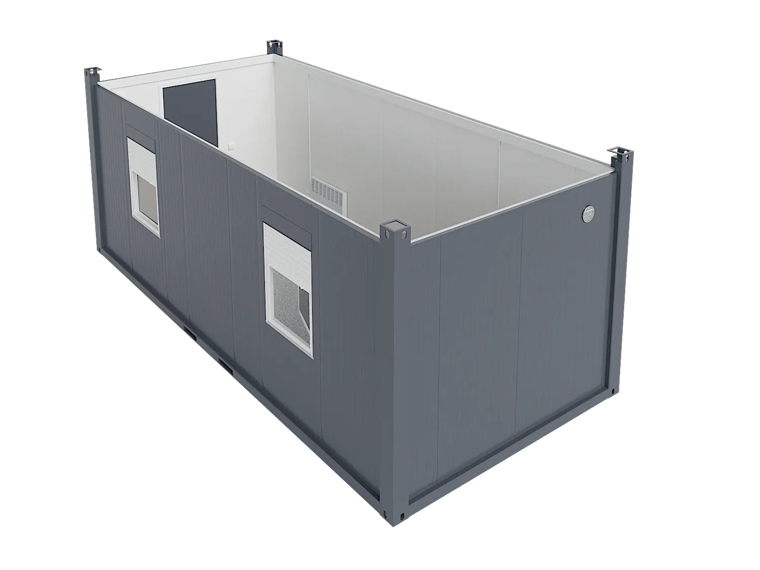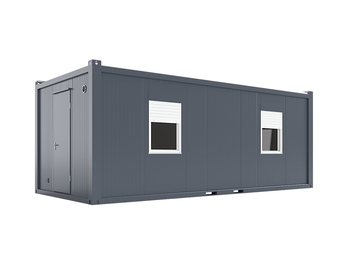 The 7 × 3.2 m Break Room can be equipped with several accessories and the desired layout. Popular accessories include air source heat pumps, computer sockets, heat recovery ventilation machine, and additional windows. The windows of the container have standard aluminium roller shutters, meaning that you can safely close up for the night, for example. Handling with crane from the corner pieces or forklift pockets.