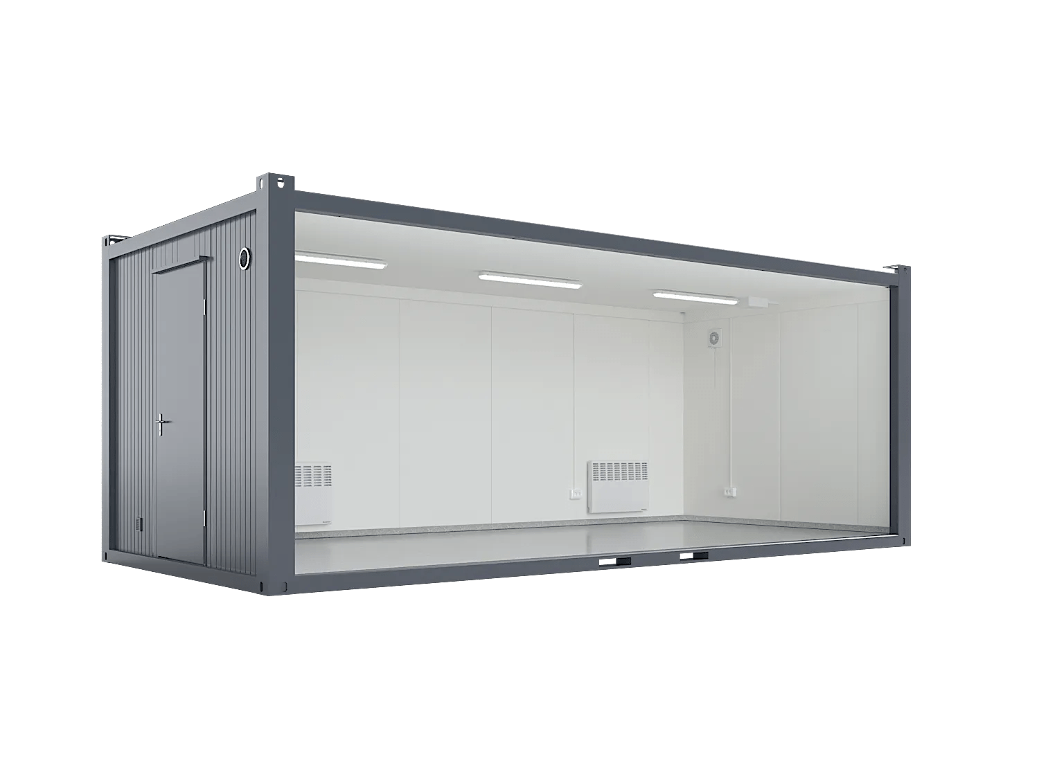 The 7 x 3.2 m Premium Break Room is a wider and longer version of the 20′ Office Container. An excellent solution when you need a little more space than a basic office container. At about 21 m², the container provides an insulated, heated office, storage or break room space with LED lights. Standard equipment for the container includes LED lights, power sockets, window, ventilation, and excellent thermal insulation, suitable for year-round use. The white surfaces and the indoor height of 2,520 mm create a bright interior. The walls are easy to keep clean as they are made of smooth sheet metal, and the grey plastic floor is very durable. Standard colours are dark grey (RAL 7024) and light grey (RAL 7035), but on request we can build your container in special colours. Containers can be linked together, with the power supplied with a 5-pin, 32A socket, which can be converted to 16A with an adapter.